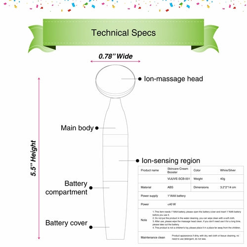 Important informationIndications• Improves aging signs, furrow lines, fine line wrinkles, age spots, firm skin, tightens skin deeply hydrates and moisturizes.• Skincare cream, serum, lotion penetration. • Increase the absorption of the active ingredients in your skincare products. Legal Disclaimer• If you have any skin infection on the face area, its recommended to consult the doctor before using this device.• Don’t use or store it in hot and humid environments. • Don’t place beside the heat appliances, to avoid fire, electric shock, and other accidents. • Facial use device only. • Avoid direct contact with your eyes. • Not intended for use on children. • Do not submerge in water. • Do not use it if the massage head appears damaged. • Please dispose of the battery properly after use. • Use durable and reliable AAA batteries for perpetual life. • Please keep it far away from children's reach. Directions• Insert 1*AAA battery to operate.• Place hand on sensor ring located in the middle of the product and touch massage head on skin. • Use Max. 10 Minutes a day. • Before using, apply cream/serum/lotion on all the areas you want to treat. • Gently move the Facial Massager back and forth to massage and normalize the oily sebum in your skin. • Please clean the massage head with a towel or a tissue after use. • The face products should be of mild viscosity for max effects. |